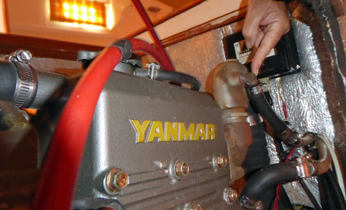 There's nowhere better in the West Indies than Sint Maarten to buy boat stuff or get things done. Prices are good (tax free), parts are readily available and boatyard services are excellent. We had a few things to buy and I wanted to get a professional opinion as to why the exhaust elbow had carboned up. I spoke to Greg at Simpson Bay Lagoon Diesel Company about it, an acredited Yanmar expert. "Yanmars are renowned for it", he said. "Best to get the elbow off and cleaned out every 1,000 hours or so". So that's we did, and was I mightily pleased that we did so - it was in a very poor state, almost choked with a thick carbon deposit. Greg cleaned it out to as new condition using a machine Diesel Co had for the purpose and refitted it - cooling water now ran in copious amounts from Alacazam's exhaust. Job done, for another 1,000 hours anyway. Owners of Yanmar marine diesels, take note! My tendency to nurse the engine hadn't helped. Marine diesels need to be run hard from time to time. What is particularly bad for them is to leave them at tickover during battery charging for hours at a time. If you have to do this (fortunately we don't - a combination of solar panels, windcharger and easily charged AGM batteries makes us self-sufficient both at anchor and underway) the manufacturers advice is to race the engine every couple of hours. Do this by accelerating the engine from low speed to high speed and back to low speed - then do it again four more times. The cruising budget got quite a bashing in Sint Maarten. Not just at Lagoonies Bar, but also in the chandleries. First I decided it really was time to replace the 10mm (3/8 inch) anchor chain - all 70m of it. Then the inverter decided to call it a day, and was pronounced beyond economic repair. Fortunately I was able to replace it at reasonable cost with a 1,000 watt Modified Sine Wave Sinergex unit. I was just about to skip the old one when I noticed the 12v cooling fan in the base of the unit. Might come in handy, I thought. And so it did. I fitted it in the fridge compressor compartment where it now improves ventilation by removing the warm air produced by the compressor and replaces it with cool air drawn from the bilge. The fan draws just 0.1amps but reduces the cycling time of the air-cooled Waeco fridge compressor unit, providing a considerable net improvement in efficiency.