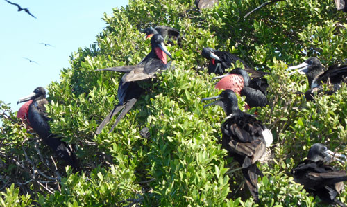 Frigate birds are seen all over the Eastern Caribbean, wheeling and soaring high above the ocean. Although they live entirely on fish they're not diving birds and never land on the surface of the sea - their huge wingspan relative to their body size would prevent them from taking off again - so they have two principal approaches to cathing fish: