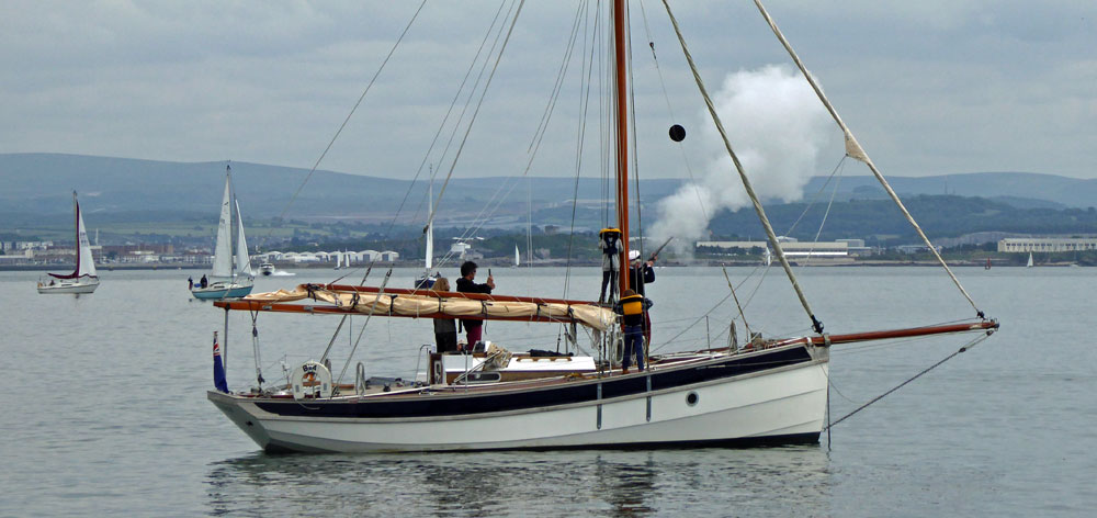 One of the entrants told me of another 'guideline':- "If you get in trouble" he said, "you drown quietly and don't make a fuss." Predictably, this event attracts a very special self-reliant and pragmatic type of sailor and some very interestingly adapted cruising boats. Mary and I were invited aboard the TRSC's President Terry Orton's boat 'Rumteazer' (a UFO 34) to accompany the Jester boats down-river to the start line in an initially windless Plymouth Sound. Here are a few of them...